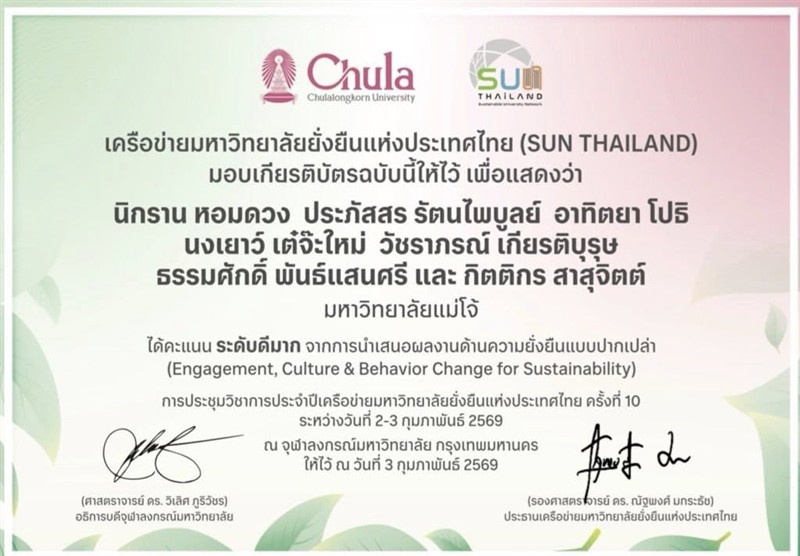 ได้รับคะแนนระดับ ดีเยี่ยม จากการประกวดโครงงานความยั่งยืนระดับนิสิตนักศึกษา ในหัวข้อ Engagement, Culture & Behavior Change for Sustainability