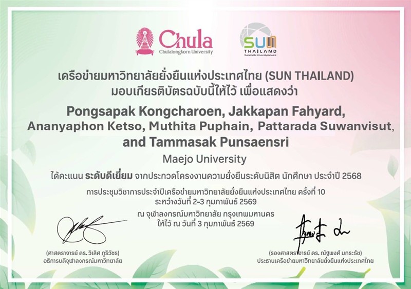 ผลงานของ Pongsapak Kongcharoen, Jakkapan Fahyard, Ananyaphon Ketso, Muthita Puphain, Pattarada Suwanvisut และ Tammasak Punsaensri จากมหาวิทยาลัยแม่โจ้