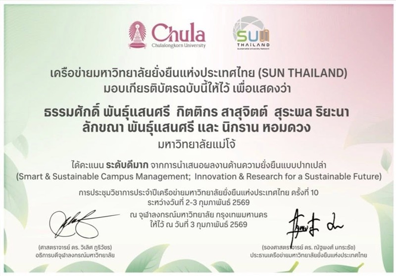 ได้รับคะแนนระดับ ดีมาก จากการนำเสนอผลงานด้านความยั่งยืนแบบปากเปล่า ในหัวข้อ Smart & Sustainable Campus Management; Innovation & Research for a Sustainable Future
